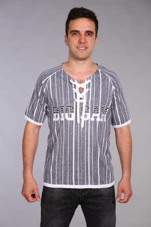 Комфортная повседневная мужская футболка прямого силуэта, с короткими рукавами и оригинальным принтом. Футболка выполнена из хлопкового трикотажа. Горловина овальной формы с разрезом и люверсами со шнуровкой. Отличный вариант для повседневного гардероба.