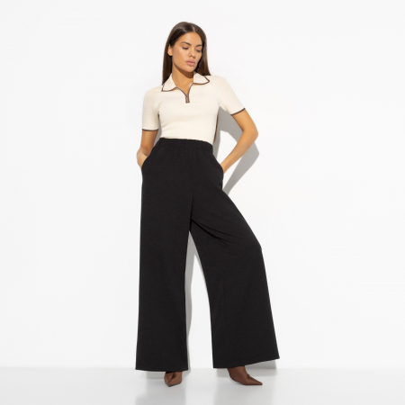 Эти брюки «Модный вопрос» от CHARUTTI станут идеальным выбором для вашего розничного бизнеса, если вы хотите предложить своим клиентам стиль и комфорт одновременно. Выполненные из качественного материала, который состоит на 95% из полиэстера и на 5% из эластана, эти брюки гарантируют долговечность и удобство в носке. Брюки-палаццо свободного кроя с резинкой на поясе и наличием карманов идеально подходят для любой фигуры, что делает их универсальным решением для вашего ассортимента.