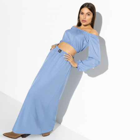 Самый чувственный тренд – открытые плечи. Что может быть более женственным? Этот комплект включает топ, открывающий живот, и юбку в длине макси. Такой образ идеально подходит для тех, кто хочет подчеркнуть свою женственность и уверенность. Оптовая закупка позволит вам предложить этот тренд своим клиентам по привлекательной цене.