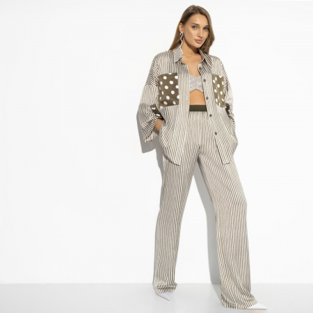 Создайте безупречный образ с минимальными усилиями благодаря нашему брючному костюму «Девиз бизнес-леди». Представленный в трендовой полоску, этот костюм идеально подходит как для деловых встреч, так и для повседневной носки. Великолепно сидящий крой подчеркнет вашу фигуру, добавляя уверенности и шарма вашему образу. Станьте иконой стиля с нашим костюмом CHARUTTI.