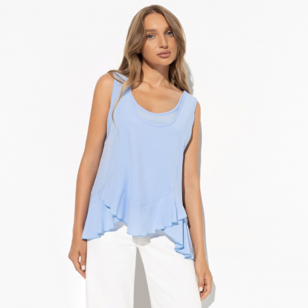 Синяя расцветка топа «Элегантный момент» идеально подходит для создания утонченных и стильных образов. Безрукавный дизайн с круглым вырезом, который имитирует два слоя изделия, добавляет уникальности и изысканности. Рюши, украшающие вырез, придают дополнительную женственность и романтичность. Этот топ станет отличным выбором для клиентов, которые ценят качество и стиль.