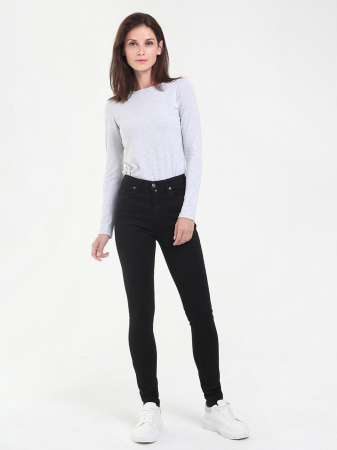 Женские классические джинсы с пятью карманами. Посадка Skinny fit (сильно облегающие по бедру). Специально завышенная талия. Для улучшения посадки по талии сделан подкройной пояс из 2-х частей. Застежка на молнии. Узкие по низу. Выполнены из эластичной ткани denim stretch, цвет ткани Black/Black (лицевая и изнаночная стороны ткани черные). Специальная стирка для сохранения цвета нестиранной ткани. Длина шагового шва для роста 32 - 78 см, для роста 34 - 83 см. Параметры указаны для размера 28.