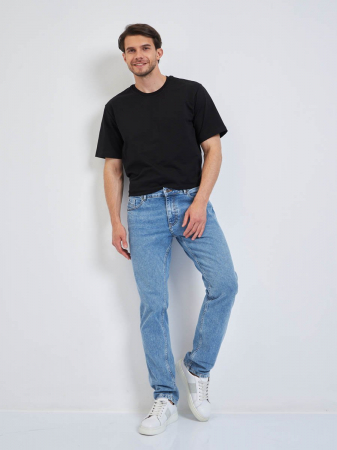 Мужские стильные джинсы с пятью карманами. Задние карманы оригинального дизайна. Посадка Regular fit (полуоблегающие по бедру). Немного заниженная талия спереди, высокая сзади. Зауженные к низу. Выполнены из эластичной ткани denim stretch. Средняя стирка с потёртостями и "усами" спереди и потёртостями сзади. Параметры указаны для размера 32. Длина внутреннего шва - 81,0 см.