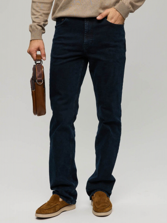Мужские классические джинсы с пятью карманами. Посадка Regular fit (полуоблегающие по бедру), высокая талия, немного заужены к низу. Застежка на молнии. Выполнены из эластичной ткани denim stretch, цвет ткани Blue/Black (лицевая сторона ткани темно-синяя, изнаночная сторона- черная). Темная стирка со потёртостями только по швам.