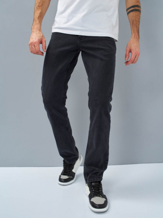 Мужские модные джинсы с пятью карманами. Посадка Regular fit (полуоблегающие по бедру), конструкция бокового шва прямая - Straight cut. Низкая высота талии спереди и высокая сзади. Застежка на молнии. Зауженные к низу. Выполнены из слабоэластичной ткани denim comfort stretch, цвет ткани Black/Black (лицевая и изнаночная стороны ткани черные). Классическая темная стирка с потёртостями только по швам.