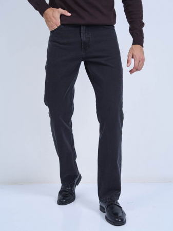 Мужские классические джинсы с пятью карманами. Посадка Regular fit (полуоблегающие по бедру), высокая талия, немного заужены к низу. Застежка на молнии. Выполнены из традиционной хлопковой ткани denim, цвет ткани Black/Black (лицевая и изнаночная стороны ткани черные) .Классическая темная стирка с потёртостями только по швам.