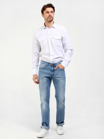 Мужские модные джинсы с пятью карманами. Посадка Regular fit (полуоблегающие по бедру), средняя высота талии спереди и высокая сзади. Застежка на молнии. Зауженные к низу. Выполнены из эластичной ткани denim stretch (эластичность 40%). Средняя стирка со слабовыраженными потёртостями и "усами" спереди и потёртостями сзади. Параметры указаны для размера 32. Длина внутреннего шва для роста 32 - 83,0 см., для роста 34 - 88,0 см.