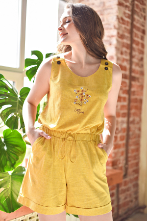 Комбинезон полуприлегающего силуэта без рукавов с шортами внизу изделия, из гладкокрашеного х/б трикотажного полотна. Изделие на широких бретелях, с застёжкой на петли - пуговицы. Полочка с вышивкой и кокеткой. Горловина спинки и проймы окантованы бейкой из основного полотна. На шортах боковые карманы и цельнокроенные манжеты. По линии талии кулиска на резинке со шнуром из основной ткани, позволяющая дополнительно регулировать объём изделия.