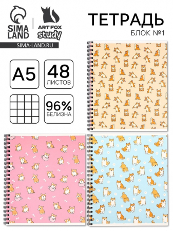 Тетрадь в клетку 48 листов А5, на спирали, внутренний блок №1 «Корги» МИКС (арт. 10187362)