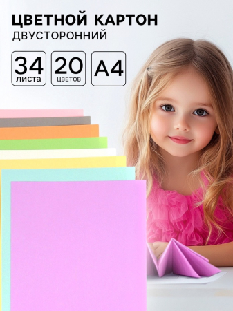 Цветной картон А4 тонированный, 34 листа, 20 цветов, 180 г/м (арт. 10660528)
