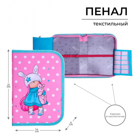 Пенал 1 секция 140 х 210 х 40 мм, откидной карман и косметичка, тканевый, Calligrata TOP Content "Девочка с зайчиком" (арт. 9305820)