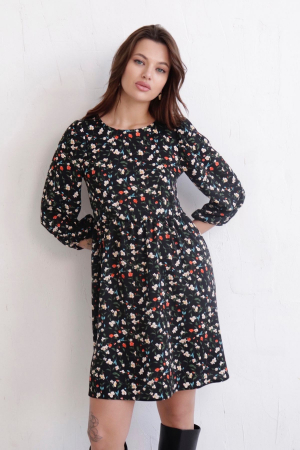 Платье отрезное по талии, с присборенной юбкой. Вырез горловины округлый, неглубокий. Рукава объемные, со складками, длиной 3/4, внизу собраны на тонкую бейку. Сзади по спинке - застежка на молнию.