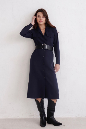 Платье-рубашка длины "миди" с застежкой на пуговицы. У платья английский воротник с лацканами и длинные рукава с манжетами на пуговицах. В комплекте - тканевый пояс с металлическими полукольцами.