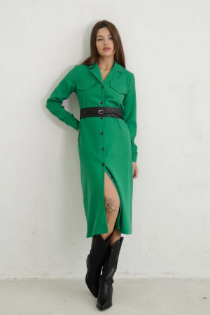 Платье-рубашка длины "миди" с застежкой на пуговицы. У платья английский воротник с лацканами, декоративные клапаны на груди, длинные рукава с манжетами на пуговицах. В комплекте - тканевый пояс.
