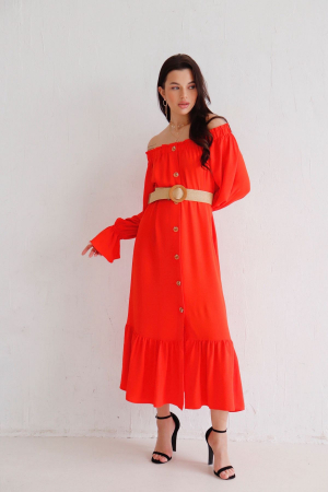 Длинное платье-рубашка с вырезом "кармен". Застежка на пуговицы, по верху платья - эластичная резинка. Рукава длинные, свободные, с резинкой на запястье. По низу платья - широкая оборка. Без пояса.