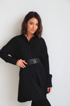 Удлинённая рубашка из вискозы свободного силуэта с супатной застежкой. Линия плеча спущенная, рукав с манжетой на пуговице. Низ рубашки закруглен по бокам.