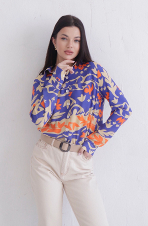 Рубашка классического покроя с ярким принтом. Силуэт прямой, застёжка на пуговицы, рукава втачные.