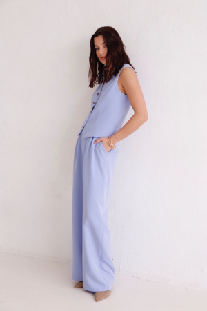 Костюм из жилета и брюк. Жилет на подкладе классического покроя, слегка приталенный, с застёжкой на пуговицы. Свободные брюки со складками у пояса, с карманами и широкими шлевками под ремень, застежка на молнию и пуговицу. В поясе - вставки эластичной резинки для комфортной посадки.