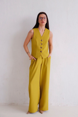 Костюм из жилета и брюк. Жилет на подкладе классического покроя, слегка приталенный, с застёжкой на пуговицы. Свободные брюки со складками у пояса, с карманами и широкими шлевками под ремень, застежка на молнию и пуговицу. В поясе - вставки эластичной резинки для комфортной посадки.