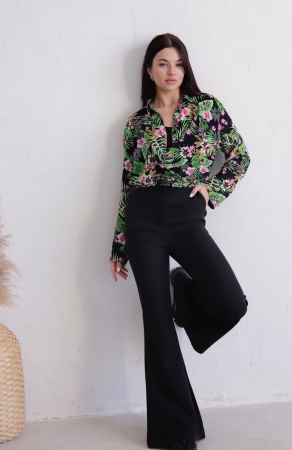 Свободная рубашка с ярким тропическим принтом. Застёжка на пуговицы, рукава со слегка спущенным плечом, прямые, без манжет. Низ рубашки разноуровневый, закруглённый.