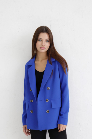 Двубортный жакет с английским воротником. Жакет продублирован подкладом, застёгивается на крупные контрастные пуговицы, рукава с отложными манжетами, декоративные клапаны.
