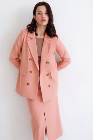 Двубортный жакет с английским воротником. Жакет продублирован подкладом, застёгивается на крупные пуговицы, рукава с отложными манжетами, декоративные клапаны.