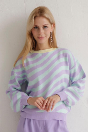 Очаровательный джемпер с диагональными полосками нежных оттенков. Джемпер свободного силуэта, линия плеча спущена, рукава объёмные с узкими манжетами. Вырез горловины округлый с контрастной бейкой.