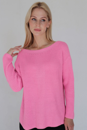 Джемпер свободного прямого силуэта с длинными рукавами и спущенной линией плеча. Вырез горловины - лодочка, обрамлён широкой планкой.