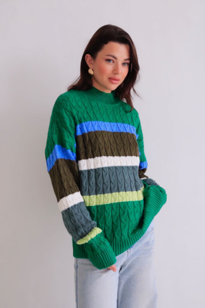 Удлинённый свитер с разноцветными полосами связан узором с косами. Линия плеча спущена, невысокий воротник-стойка.