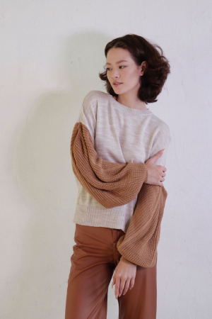Джемпер, сочетающий в себе разные объёмы и фактуры. Перед и спинка связаны тонкой гладью, а широкие объёмные рукава - рельефной резинкой, и собраны внизу на узкие манжеты. Вырез горловины округлый.