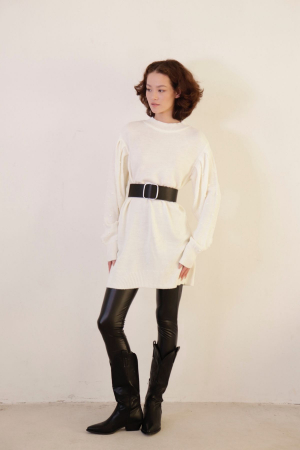 Удлинённый джемпер-туника свободного силуэта можно носить и как мини-платье. Джемпер связан гладью, объёмные рукава со спущенной линией плеча и складками украшены аккуратными шишечками, вырез горловины округлый.