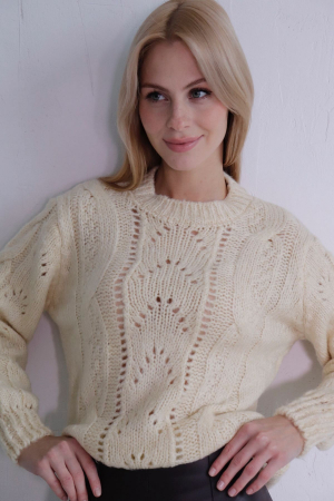 Джемпер из пряжи с шерстью мериноса связан ажурным узором. Рукава объёмные, собраны у запястья на узкие манжеты. Горловина округлая с широкой бейкой.