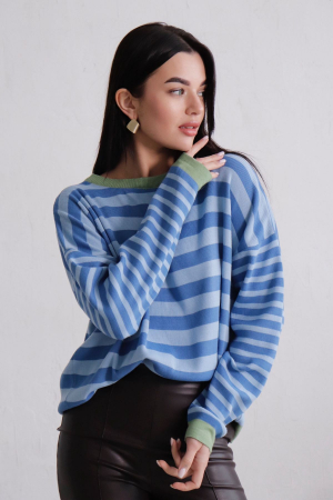 Джемпер в полоску из пряжи с хлопком. Модель прямого силуэта, рукава длинные, со спущенной линией плеча. Вырез горловины неглубокий, округлый.