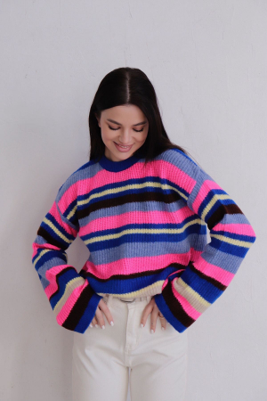 Яркий джемпер в полоску крупной вязки. Модель прямого силуэта, со спущенной линией плеча и длинными широкими рукавами.