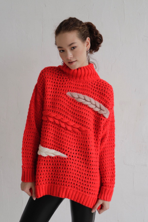 Свитер свободного силуэта связан узором в виде сетки и декорирован объёмными косами. Плечо спущено, высокий воротник, широкие резинки по низу изделия и рукавов.