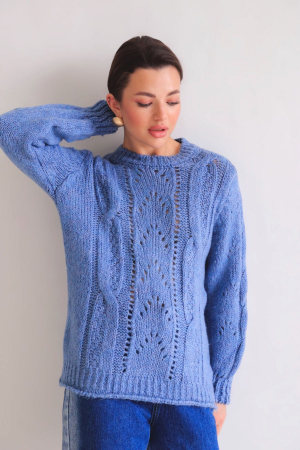 Джемпер из шерстяной пряжи связан ажурным узором. Рукава объёмные, собраны у запястья на узкие манжеты. Горловина округлая с широкой бейкой.