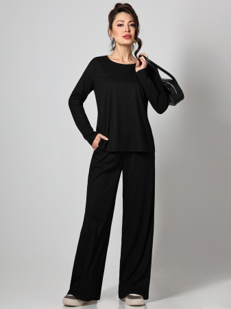 Брючный костюм выполнен из трикотажа "лапша", обеспечивающего комфорт и эластичность при носке. Округлый вырез горловины лонгслива создает лаконичный образ, а длинные рукава обеспечивают комфорт в прохладную погоду. Резинка на брюках позволяет регулировать посадку по талии без необходимости дополнительной застежки. Свободный крой брюк обеспечивает свободу движений, а полуприлегающий силуэт лонгслива подчеркивает фигуру, сохраняя при этом комфорт. Костюм подходит для повседневной носки, сочетая в себе практичность и стиль. Трикотаж "лапша" обеспечивает мягкость и приятные тактильные ощущения при длительной носке. Модель можно комбинировать с различной верхней одеждой и аксессуарами, создавая разные образы. Костюм подходит для создания как домашних, так и уличных образов, сохраняя комфорт в течение всего дня. Уход за костюмом требует бережной стирки при температуре 30 градусов, что помогает сохранить качество трикотажа и форму изделий.