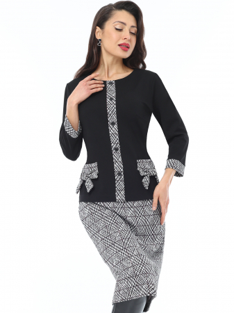 Элегантный и в чем-то даже нарядный костюм. Блузка прямого силуэта с округлым вырезом горловины украшена декоративной планкой с пуговицами и ложными карманами с аккуратными бантиками. Ткань декоративных деталей подбирается такая же, как на юбке, за счет чего достигается идеальная гармония образа.