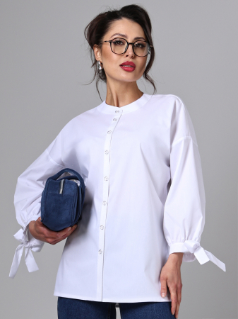Романтичная блузка белого цвета выполнена из сорочечной ткани, обеспечивающей комфорт при носке. Модель с округлым вырезом горловины и объемными рукавами создает женственный силуэт. Манжеты с завязками создают романтичный образ, подходящий для различных стилевых решений. Блузка сочетается с классическими брюками, юбками или джинсами, подчеркивая универсальность использования. Модель подходит для создания как деловых, так и более нарядных образов, сохраняя стиль и функциональность. Блузка представлена в больших размерах, что обеспечивает удобную посадку для разных типов фигур. Уход за блузкой требует бережной стирки при температуре 30 градусов, что помогает сохранить качество сорочечной ткани.