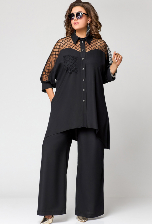 Блуза женская нарядная свободного силуэта выполнена из блузочно-плательной ткани в сочетании с декоративной сеткой с набивным принтом. Вырез горловины воротник на стойке рубашечного типа, застежка доверху на обметанные петли и пуговицы. Рукав цельнокроенный с блузой "реглан" 7/8, по низу на притачной манжете. Низ блузы фигурный, в боковых швах обработаны небольшие разрезы. Декором служит накладной карман из сетки и вставки по переду.