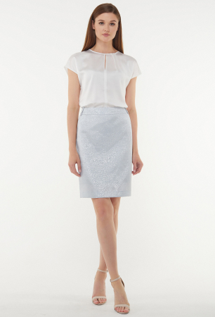 Юбка с притачным поясом со шлёвками. Передняя половинка с косыми карманами. Задняя половинка с двумя горизонтальными с рамками и двумя отделочными пуговицами со среднем швом, в котором обработаны потайная молния и шлица.