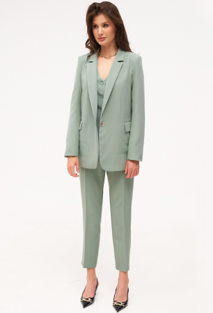 Шикарный 2-х предметный костюм, состоящий из жакета и брюк. Универсальный женский жакет на подкладке прямого силуэта. Перед с центральной застежкой на одну пуговицу, с карманами и с клапанами в шве. Воротник стояче-отложной втачной с отворотом лацкана. Рукав двухшовный, втачной. Брюки базовые со стрелками. Изделие имеет комфортную среднююю посадку. Брюки на притачном поясе со шлёвками. Спереди боковые функциональные карманы, сзади имитация прорезных карманов с листочкой.