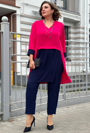 Костюм брючный женский с туникой для праздника выполнен из Легкой струящийся ткани. Длина туники по спинке 95 см. Свободный силуэт, спущено плечо. Брюки на резинке слегка заужены к низу с карманами. Длина брюк 100 см.