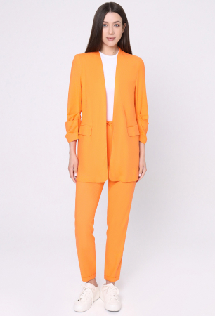 Комплект состоит из жакета и брюк. Стильный модный жакет из льняной ткани в стиле "кэжуал". Это повседневный удобный и практичный жакет, который отлично сочетается как с джинсами, так и с брюками. Жакет удлиненный, без застежки, рукава длиной ниже локтя. По переду имеются карманы. Спинка со средним швом, который заканчивается шлицей. Жакет без подкладки. Брюки свободные на резинке с декоративными шнурками по переду. Брюки из вискозной ткани. Снизу брюки чуть заужены, на манжете. По бокам карманы, сзади имитация карманов. Отличный вариант для жарких летних дней.