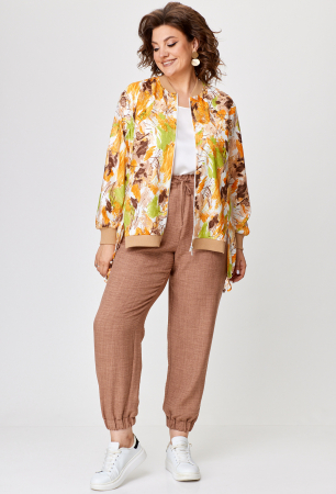 Брюки выполнены из однотонной ткани, в области бедер брюки полуприлегающие, в области колена и по низу свободные, низ брюк на притачной манжете с эластичной тесьмой. В верхней части передних половинок обработаны наклонные карманы. Пояс притачной с эластичной тесьмой, по центру пояса спереди в качестве декора продет шнур.Длина жакета по спинке в 52р - 76см, длина рукава - 57,5см. Длина брюк по бок шву без пояса - 98,5см.
