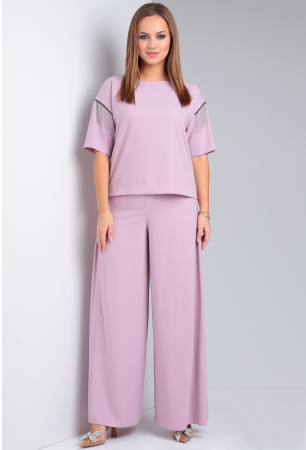 Костюм женский двухпредметный, состоит из блузы и брюк. Блуза прямого силуэта со спущенной линией плеча. Вырез горловины лодочкой. Спинка цельная. В боковых швах обработаны разрезы. Рукав короткий одношовный, декорированный в верхней части тесьмой - бахромой. Брюки расширенные к низу с притачным поясом. Застёжка на потайную тесьму - молнию в среднем шве и 1 петлю-пуговицу по поясу. На передних и задних половинках обработаны вытачки. По верхней части передних половинок брюк застрочены 4 односторонние складки с двух сторон.
