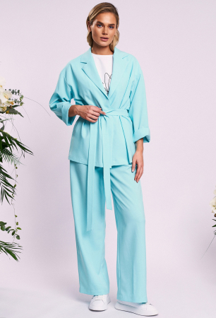 Жакет со съемным поясом, который завязывается на талии, длина до середины бёдра.Брюки женские прямого силуэта, большого объема.