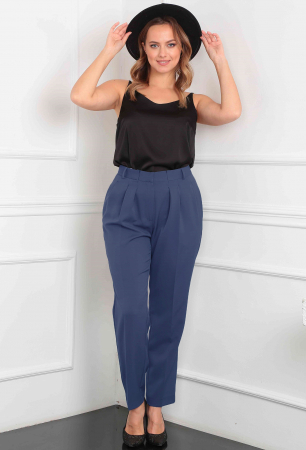 Брюки прямые, зауженые к низу. По переду брюк заложена одна складка по вытачке вниз, а вторая проходит заложеной складкой на пояс и застрочена частично. В брюках два кармана в боковых швах. По задней полвинке брюк застрочены талиевые вытачки. Брюки свысокой посадкой. На поясе настрочены шлёвки для ркмня. Застёжка брюк на молнию и потайные крючки.