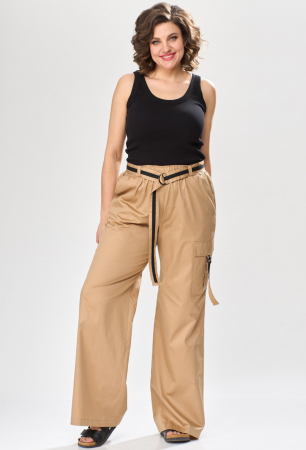 Брюки в стиле “карго” выполнены из однотонной ткани. По передним половинкам выполнены наклонные карманы. По левой передней половинке выполнен накладной карман с клапаном и хлястиком с декоративной тесьмой и застежкой на полукольца. По задним половинкам выполнены накладные карманы. Брюки на притачном поясе с эластичной тесьмой и настроченными шлевками, через которые продет пояс-ремень с застежкой на полукольца.