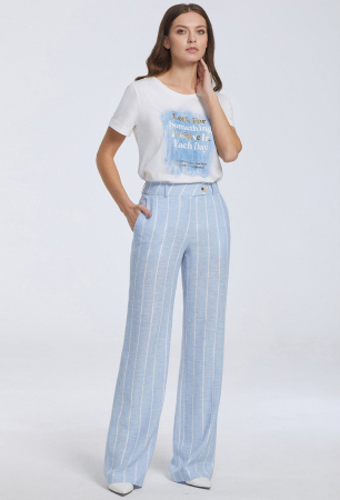 Прямые свободные брюки из льна на притачном поясе со шлёвками, спереди косые карманы, застёжка на молнию и декоративную пуговицу. Оригинальность брюкам придает стильный дизайн в широкую полоску.